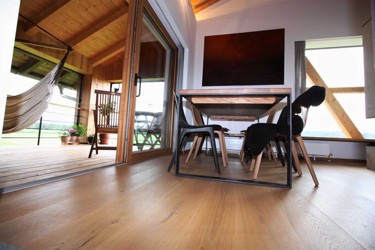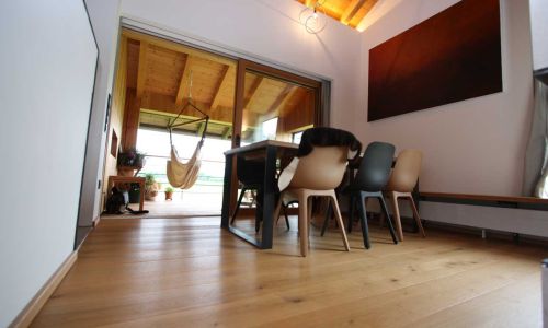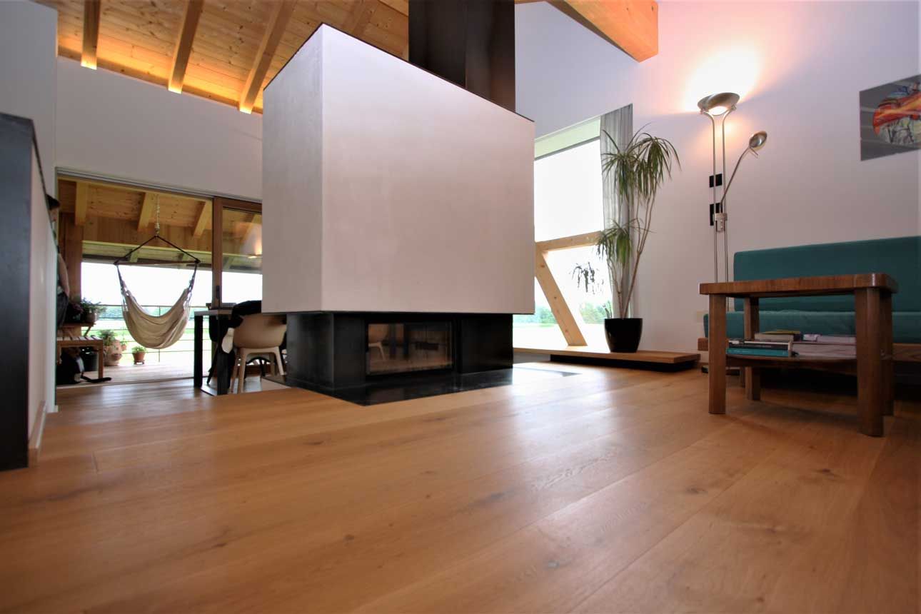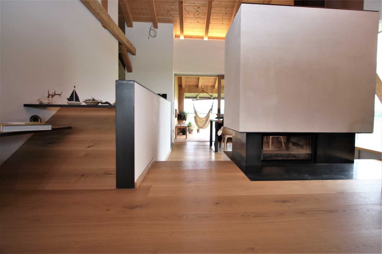 Es ist immer ein gutes Zeichen, wenn ehemalige Mitarbeiter auf Produkte der Firma zurückgreifen, für die sie selbst einmal Schweiß vergossen haben. Das zeugt von Qualität, Vertrauen, Verbundenheit und Freundschaft! Der Mitarbeiter der Holzbodenmanufaktur plante den Ausbau der Tenne eines Hofgebäudes in den Isarauen nahe Dietramszell. Der Architekt, Sebastian Beham, hat mit viel Augenmaß, Erfahrung und Geschmack ein Refugium geschaffen, das viele Anforderungen verbindet. Zum Gesamtkonzept gehörten Eichendielen im Naturton mehrfach geölt. Dielen verdeckt verschraubt auf Unterkonstruktion aus Holzweichfaser­dämmplatten mit Holzleisten.