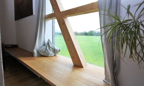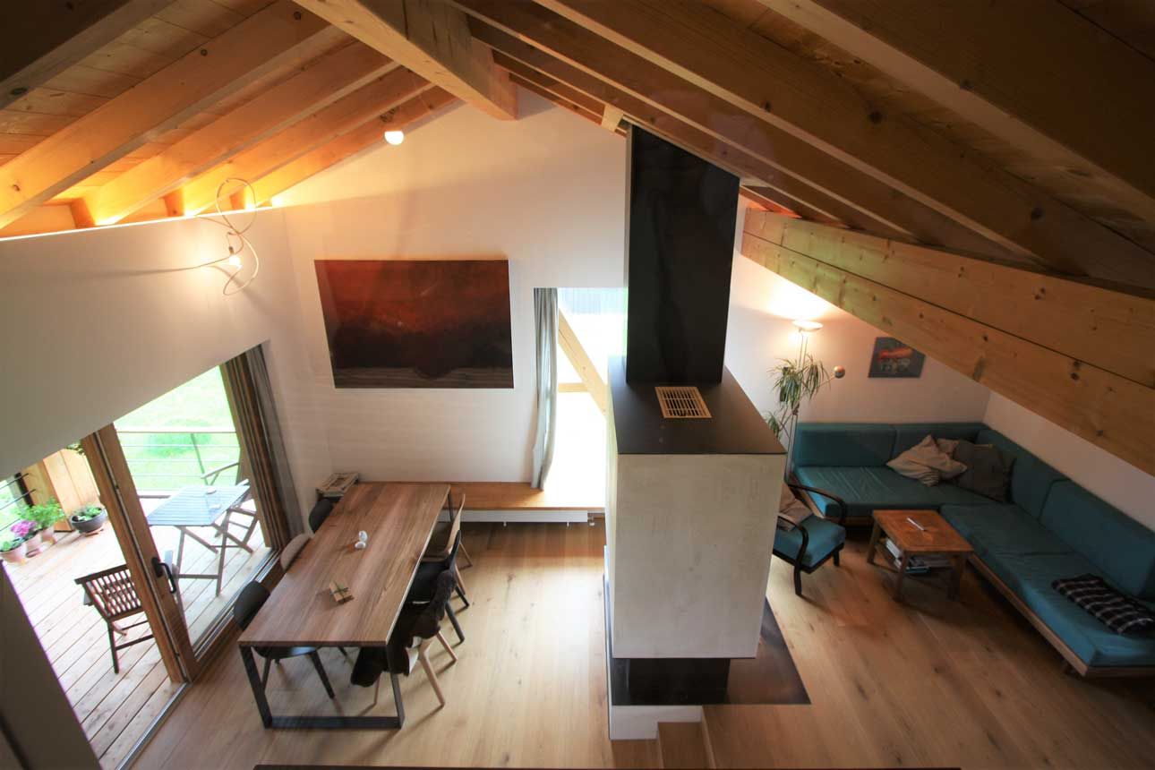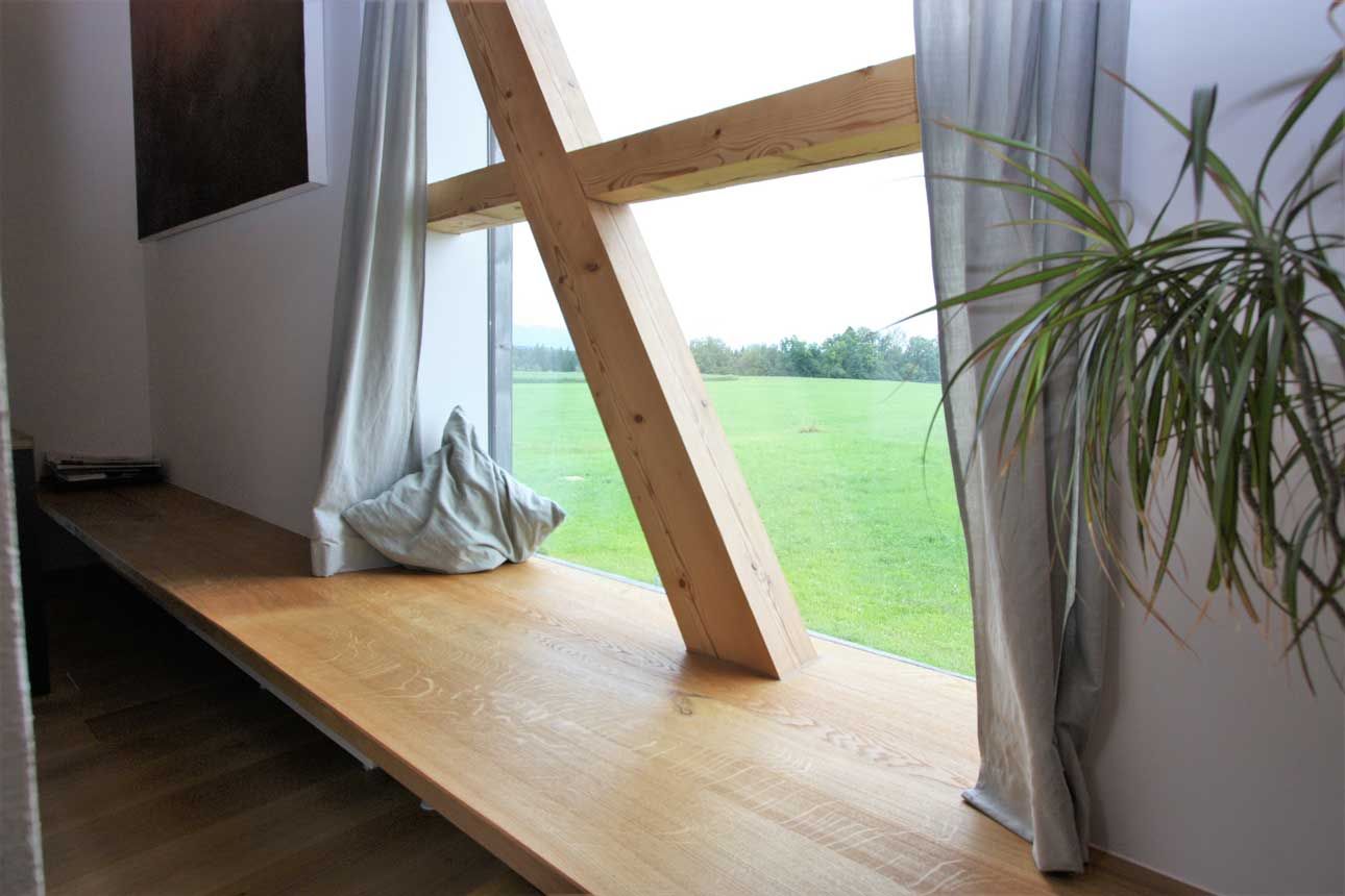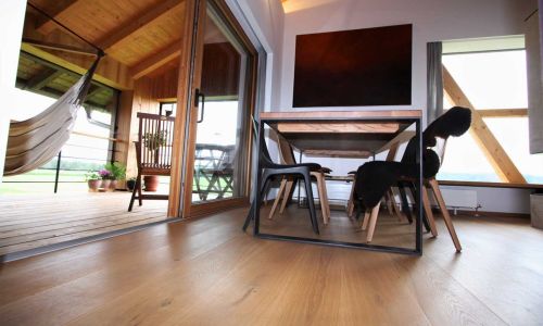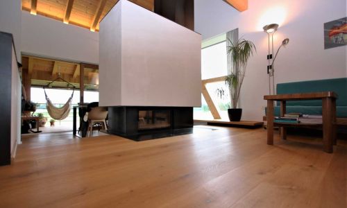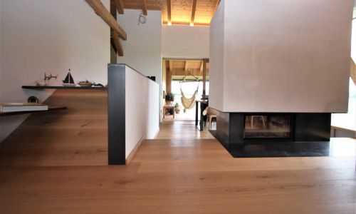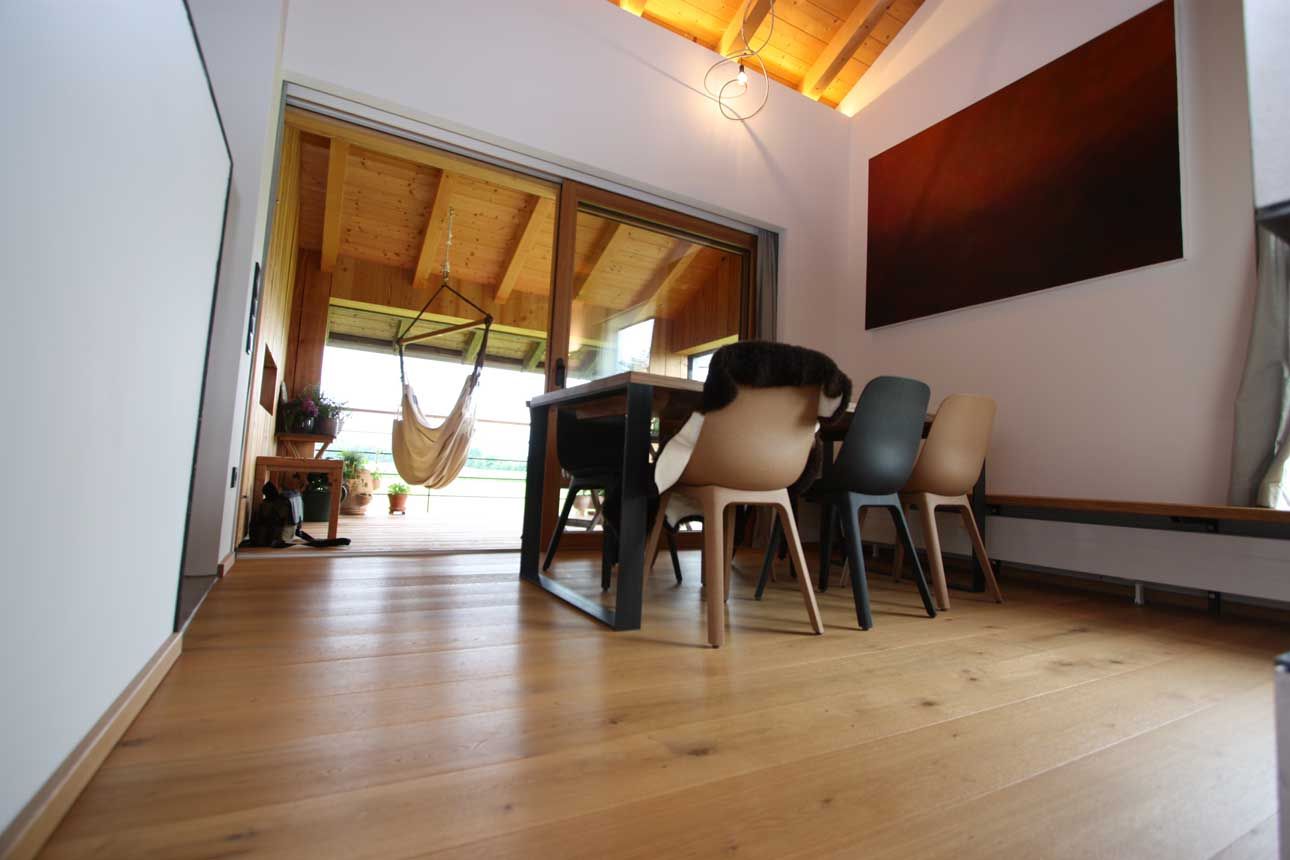 Es ist immer ein gutes Zeichen, wenn ehemalige Mitarbeiter auf Produkte der Firma zurückgreifen, für die sie selbst einmal Schweiß vergossen haben. Das zeugt von Qualität, Vertrauen, Verbundenheit und Freundschaft! Der Mitarbeiter der Holzbodenmanufaktur plante den Ausbau der Tenne eines Hofgebäudes in den Isarauen nahe Dietramszell. Der Architekt, Sebastian Beham, hat mit viel Augenmaß, Erfahrung und Geschmack ein Refugium geschaffen, das viele Anforderungen verbindet. Zum Gesamtkonzept gehörten Eichendielen im Naturton mehrfach geölt. Dielen verdeckt verschraubt auf Unterkonstruktion aus Holzweichfaser­dämmplatten mit Holzleisten.