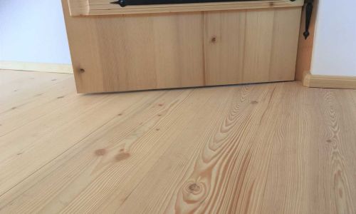 Weisstannendielen bis 26 cm Dielenbreite und auf Raumlängen (ohne Stoss). Gesamte Menge ca. 120 m². Die Oberfläche leicht gebürstet und mehrfach leicht weiß geölt.