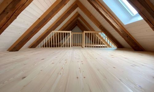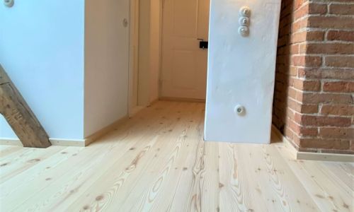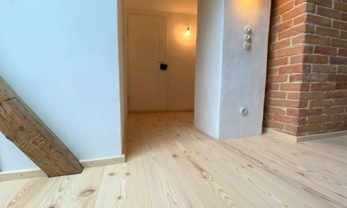 Mit erheblichem Aufwand und enormer Eigenleistung ist aus dem unscheinbaren Gebäude ein Denkmal entstanden, das im Inneren einen ganz besonderen Zauber mit hohem Wohnwert entfaltet. In zwei Räumen wurden die vorhandenen Fichtenaltholzdielen überarbeitet und wieder eingebaut. Die restlichen Flächen wurden mit raumlangen Weisstannendielen belegt.