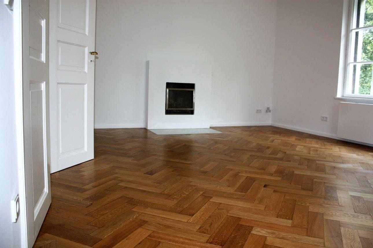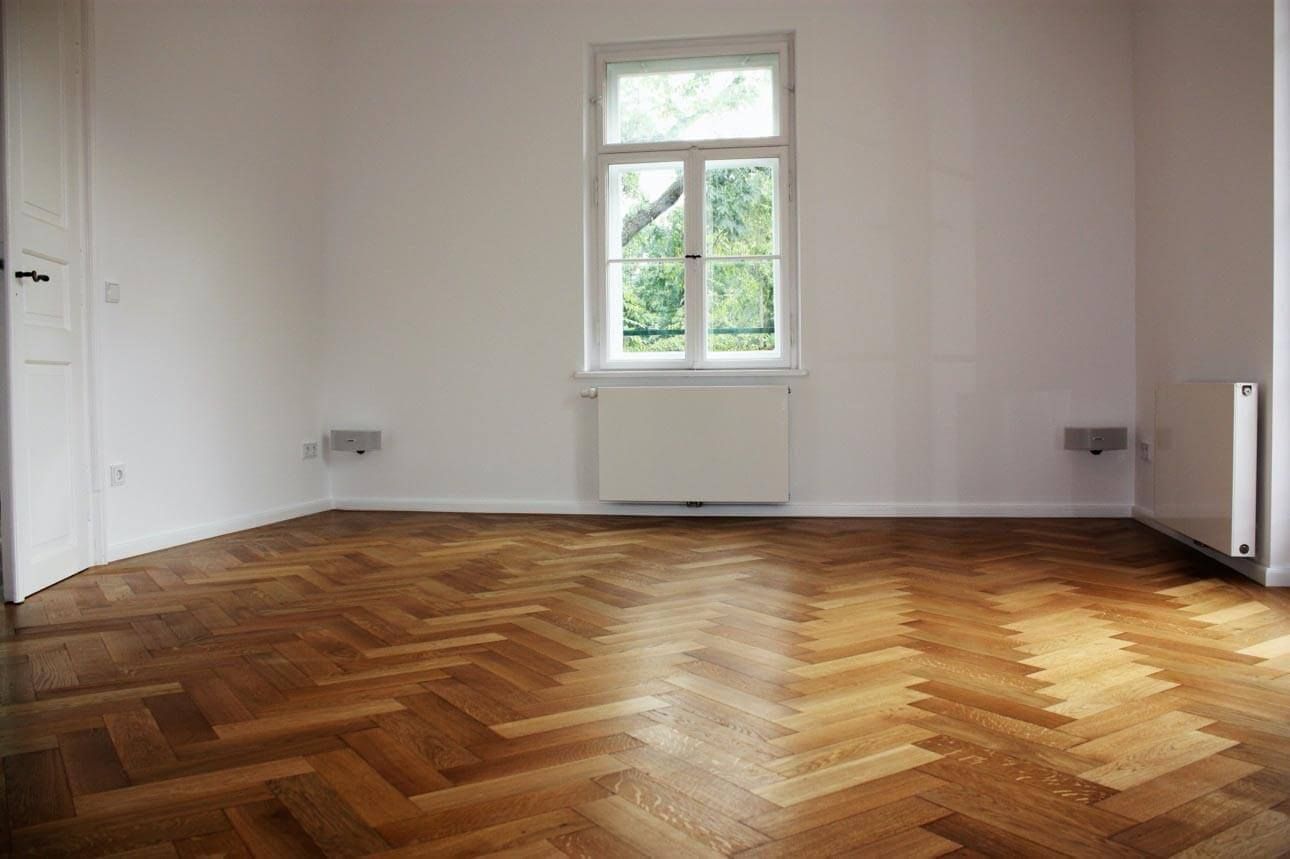 Die Besitzerin dieser Wohnung ließ den kompletten Bodenaufbau erneuern. Dazu wurde der genagelte Fischgrätparkett gelöst und komplett – Stab für Stab – in Manufaktur Manier einzeln aufbereitet und wieder eingebaut.
