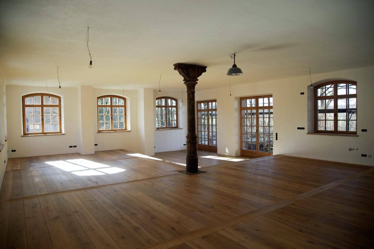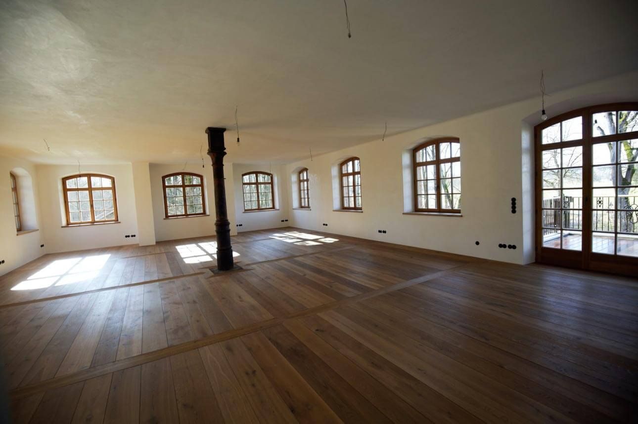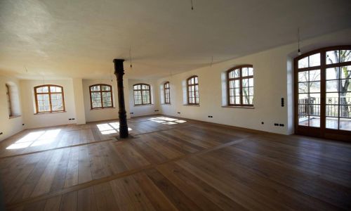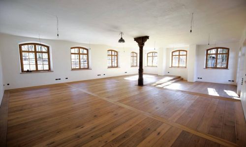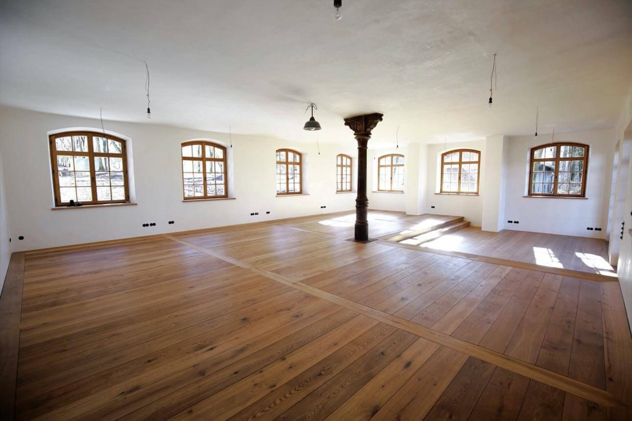 Das sowohl für gewerbliche, als auch für Wohnzwecke nutzbare Gebäude, wurde großflächig mit unseren massiven Eichendielen ausgestattet, die in Feldern mit Randfriesen verlegt wurden.