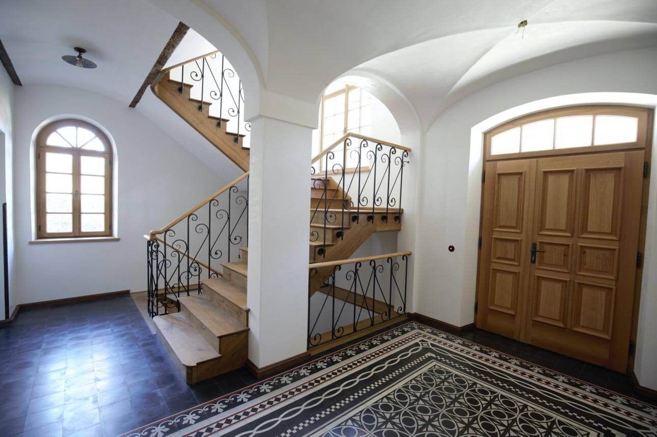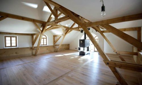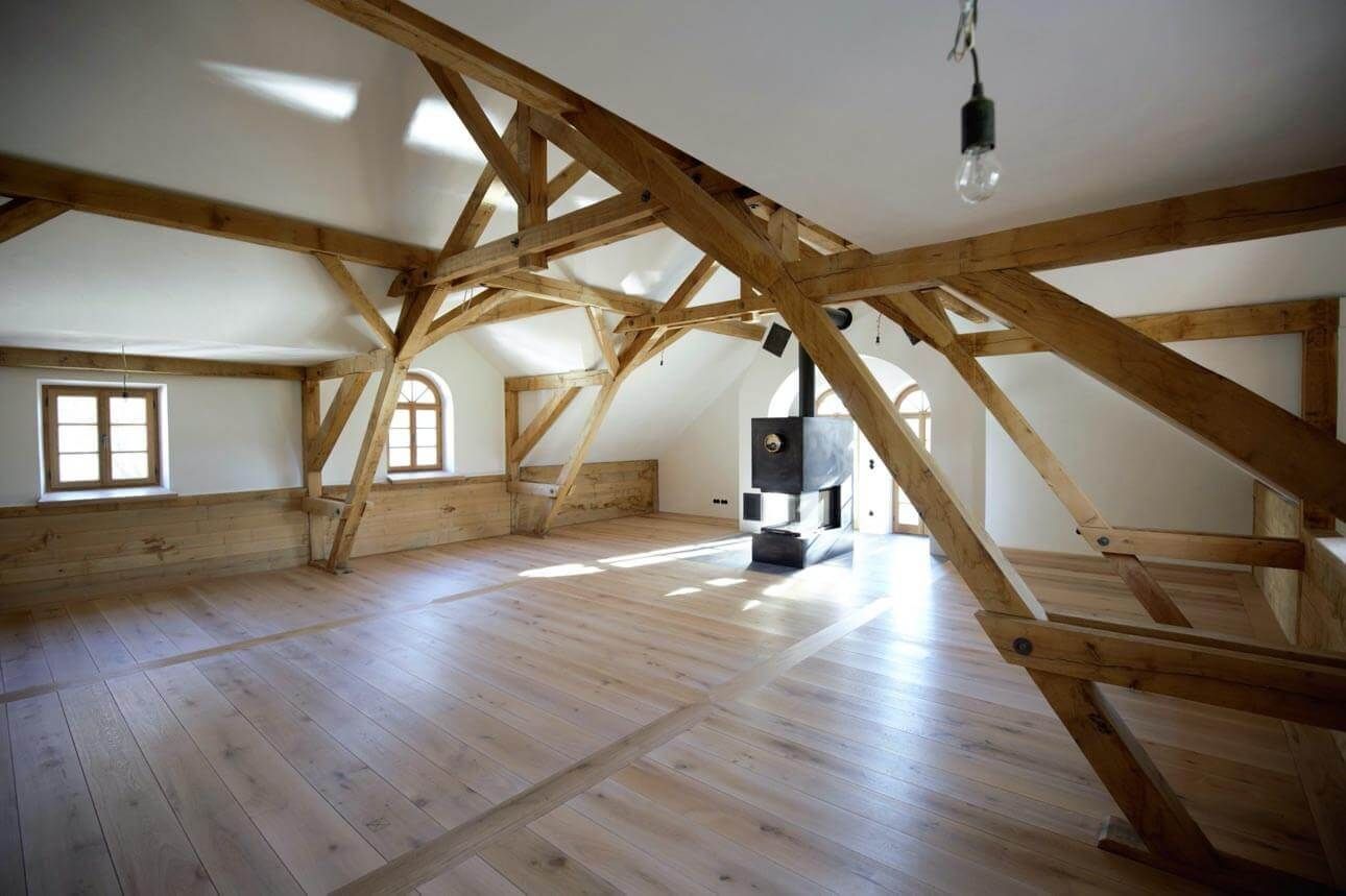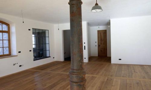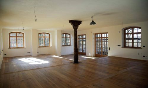Das sowohl für gewerbliche, als auch für Wohnzwecke nutzbare Gebäude, wurde großflächig mit unseren massiven Eichendielen ausgestattet, die in Feldern mit Randfriesen verlegt wurden.