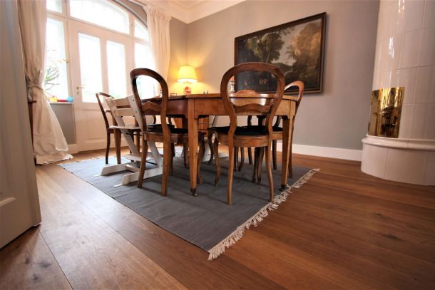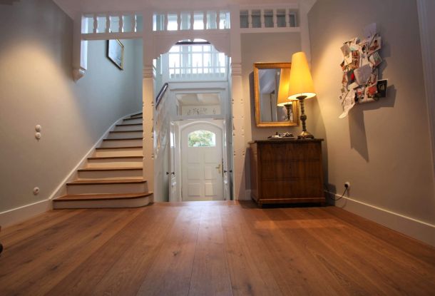 Eichendielenböden passend zur alten, bestehenden Treppenanlage, geölt in antikem Farbton, sind wichtiger Bestandteil der Restaurierung des Gebäudes. Die Dielen sind raumlang gehalten und in den Türbereichen stilgerecht durch bodenbündige Querschwellen ergänzt.