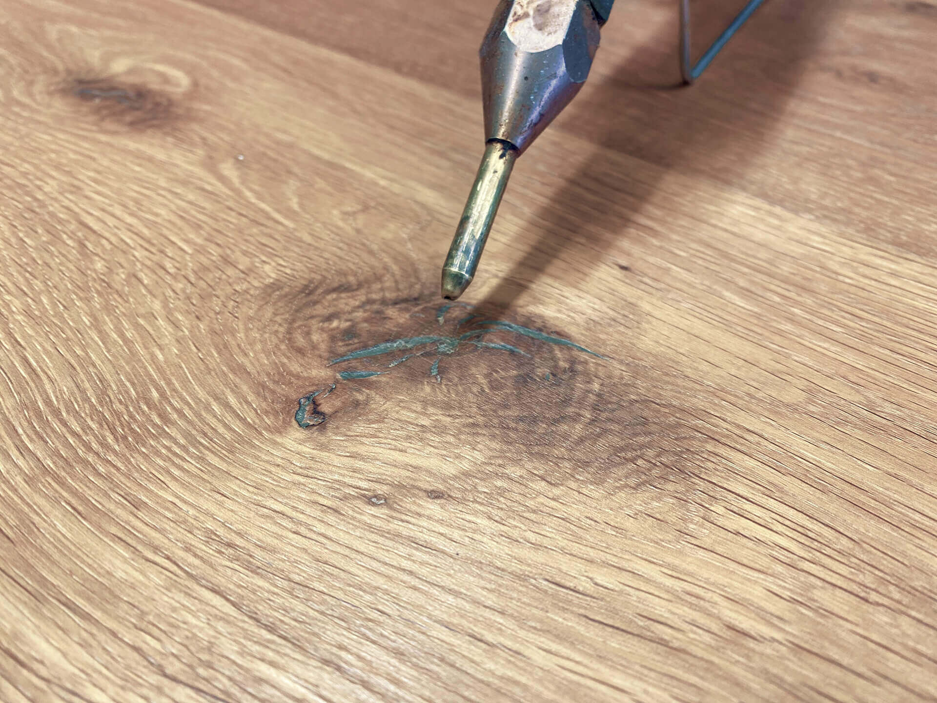 Nachdem die rohen Dielen gehobelt wurden ist der erste Schritt, dass feine Risse und Äste ausgewachst werden.