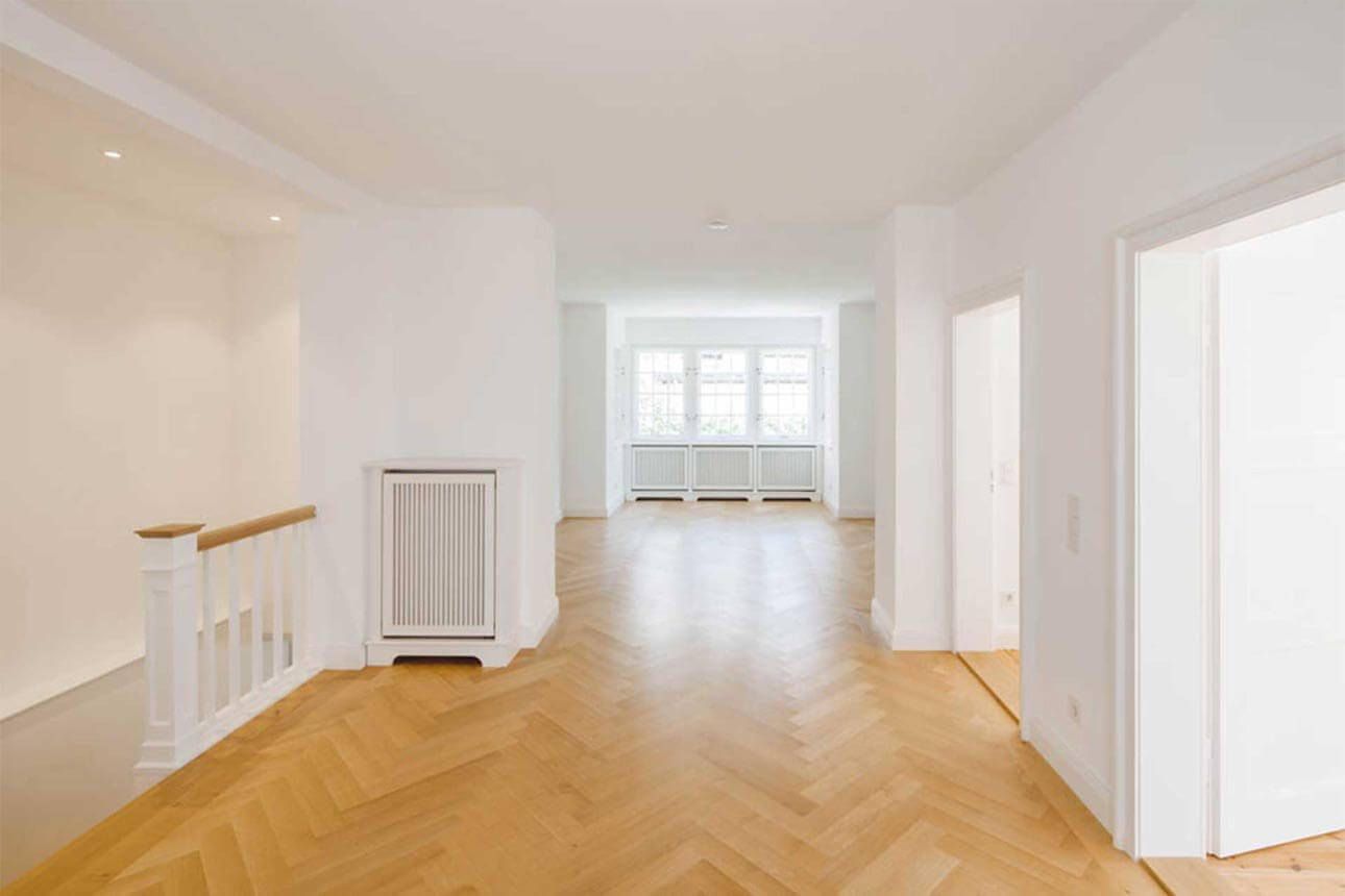 Vom Dachgeschoß bis zum Gartengeschoß entstanden attraktive, helle Räume. Mit viel Geschick ließ die Architektin Josephine Barbarino alte Bausubstanz wieder herstellen und erhalten. 100 m² von der Zeit gezeichnete, wunderschöne, alte Kieferndielenböden und altes Eichen Fischgrätparkett wurden sorgsam restauriert. Auf insgesamt ca. 120 m² Fläche wurde neues Fischgrätparkett im Massstab des alten Parketts nachgebaut und verlegt.