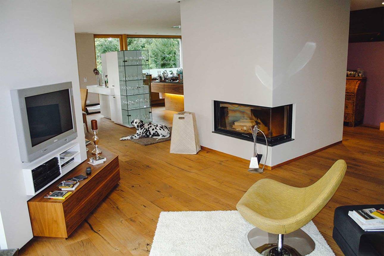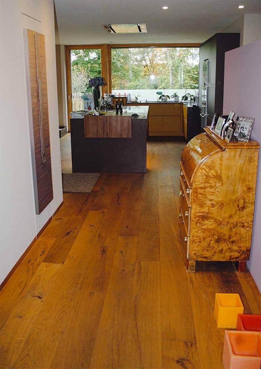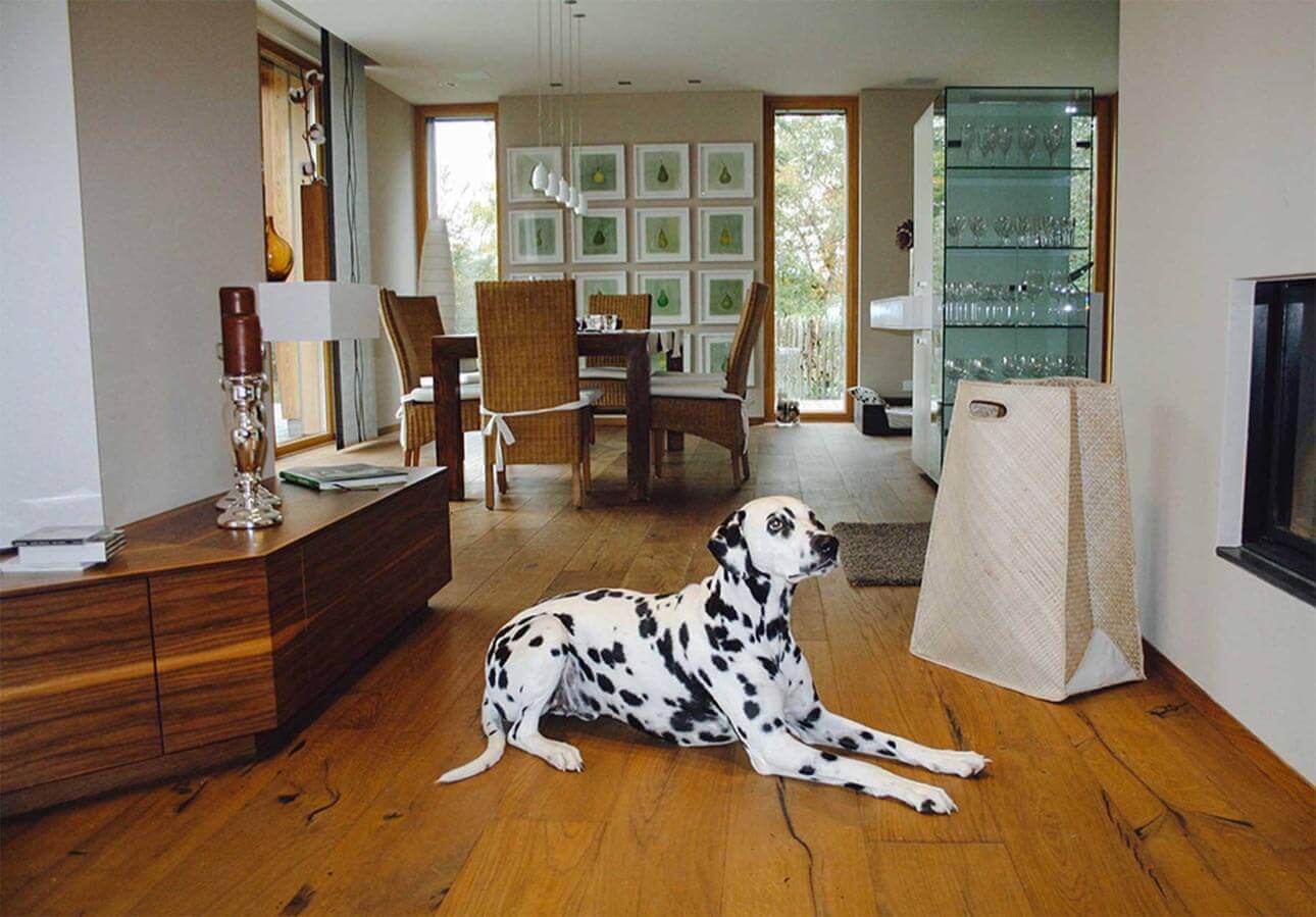 Auf einer Anhöhe außerhalb von Starnberg steht diese außergewöhnliche Villa in Holzbauweise. Das neu erstellte Objekt ist ein Passivhaus. Die massiven Holzdielenböden sind aus Eichen-Altholz hergestellt. Das Eichenholz war als Gebälk ca. 300 Jahre in einem landwirtschaftlichen Gebäude verbaut und begann demnach vor ca. 500 Jahren als Baum zu wachsen. Außergewöhnlich an dem Holz sind die fast schwarzen Einläufe an den Stellen, die von der Umgebungsluft berührt waren. Die Dielen sind in Breiten zwischen 18 und 22 Zentimeter Deckbreite hergestellt und bis zu 5,0 Meter lang. Der Dielenboden liegt auf Fußbodenheizung.