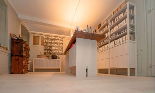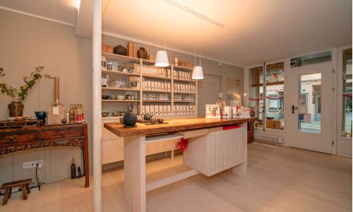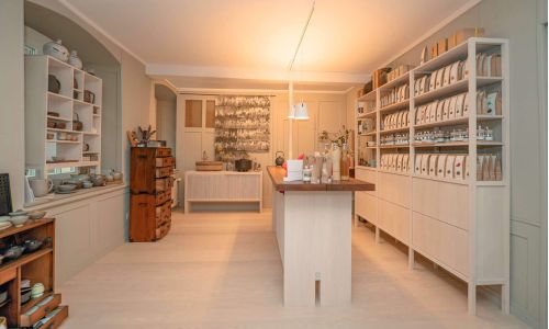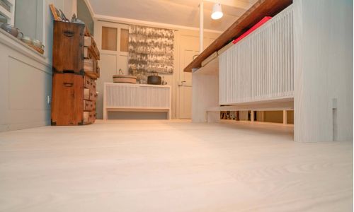 Zur insgesamt hellen Einrichtung sollte auch der Boden passen. So wurden Muster erstellt und letztendlich fiel die Entscheidung auf einen sandweißen Eschendielenboden. Wir wünschen der Inhaberin viel Erfolg und allen Kunden eine angenehme Zeit beim Aufenthalt im Geschäft und beim Teegenuss.