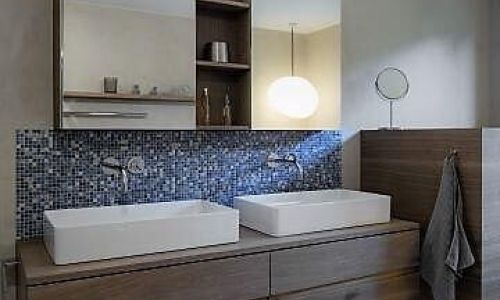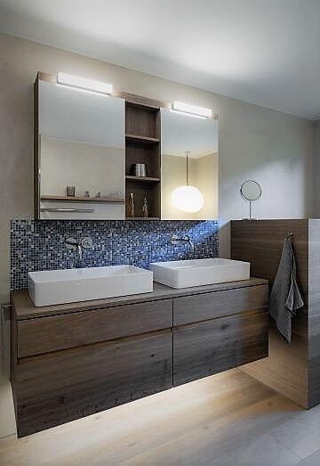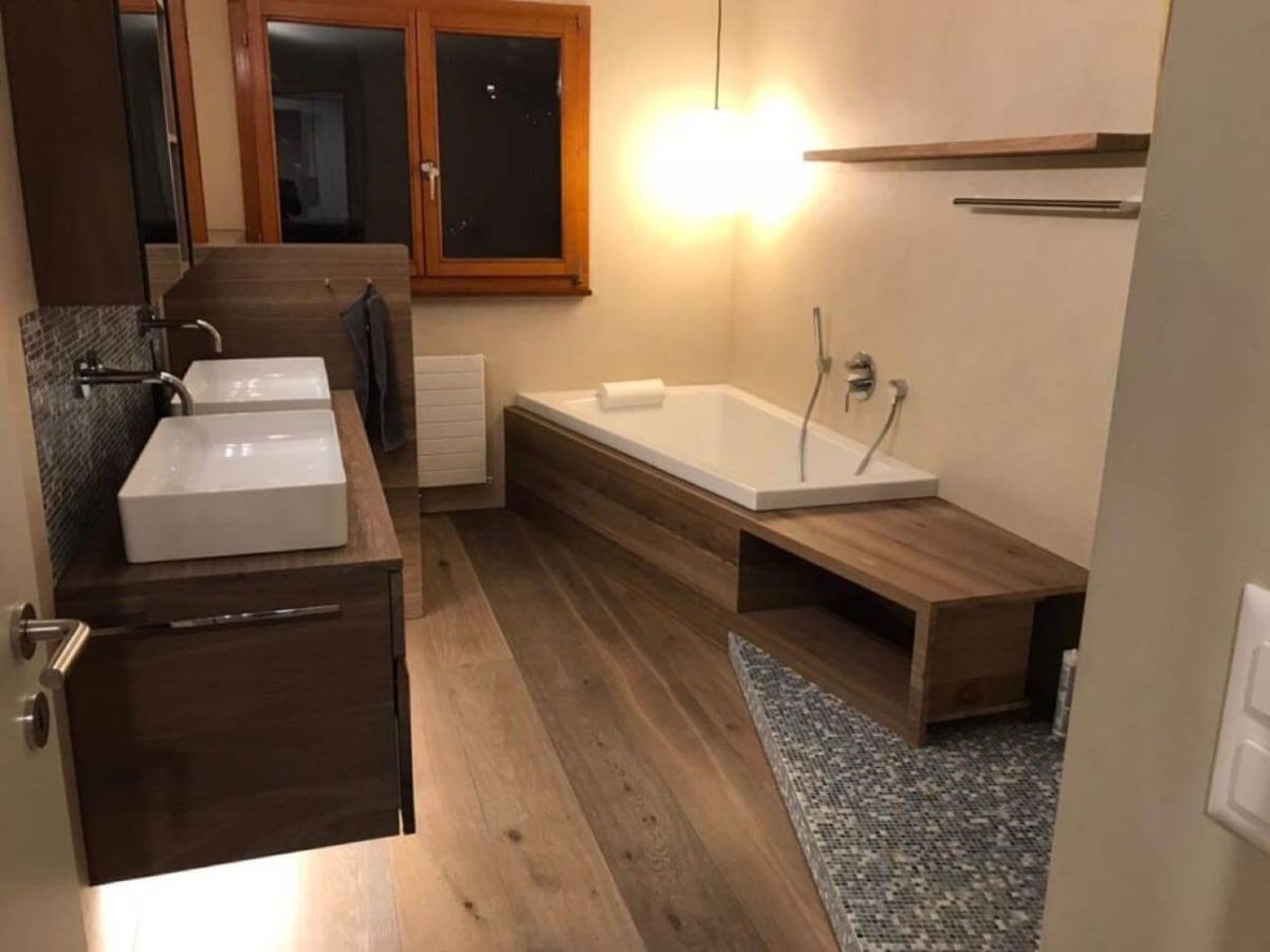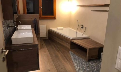 Das hier abgebildete Badezimmer ist in Zusammenarbeit mit dem Schweizer Architekten Peter Wagner vom Architekturbüro Lötscher in Meggen entstanden. Die Schreinerei von Rickenbach hat mit den von uns vorgefertigten Möbelelementen und Eichendielen die Ausführung vor Ort übernommen.