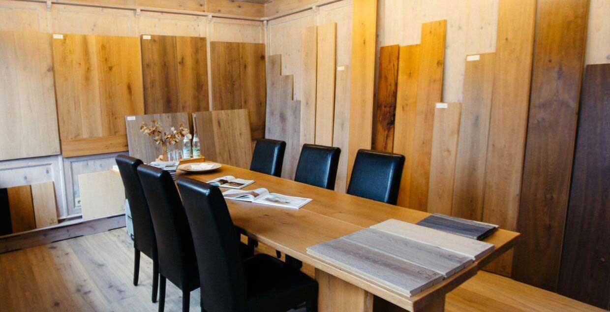 In den Werkstätten in Oberpframmern bei München sind Sie herzlich zu einer Besichtigung willkommen. Bevor Sie Ihren individuellen Dielenboden kaufen, stehen Interessenten alle Holzarten und Beispiele auf Mustertafeln zur Besichtigung bereit. Die Ausstellung der Dielen bietet einen kompletten Blick auf das Sortiment an fertigen Naturholzböden.